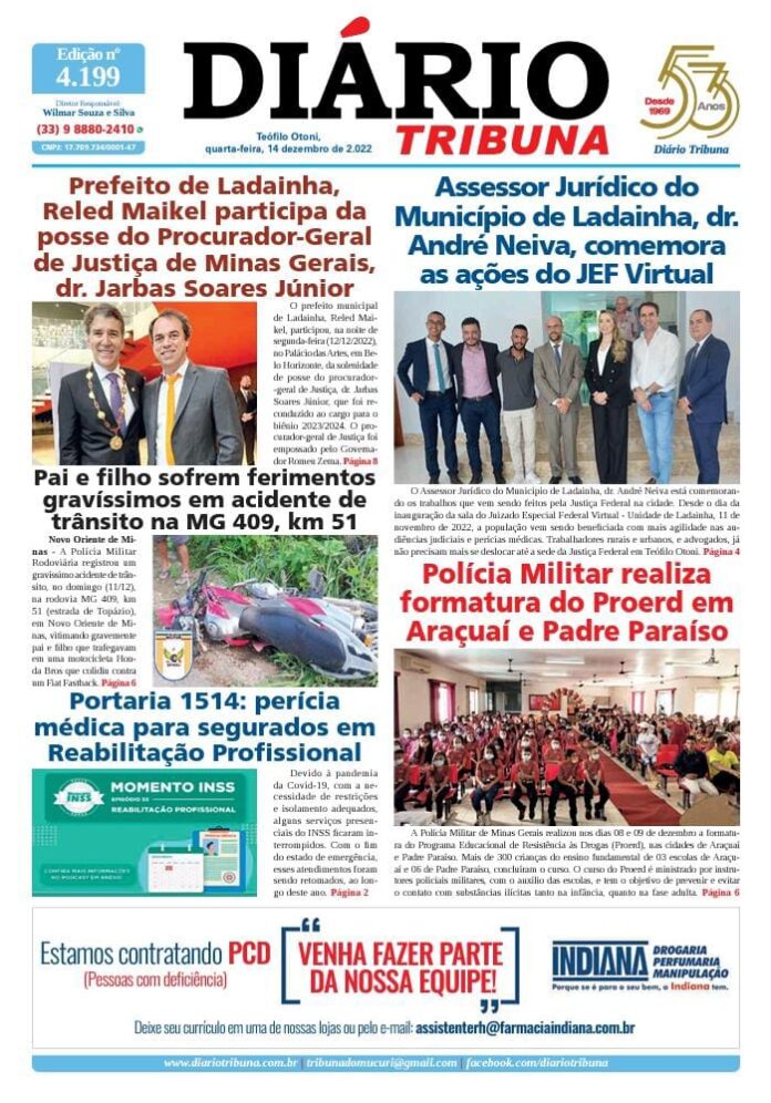 Diário Tribuna, 14 de Dezembro 2022, Teófilo Otoni – MG Por diariotribuna - 14/12/2022 0 507 Facebook Twitter Google+ Pinterest WhatsApp Acesse o link abaixo e veja a edição completa do Diário Tribuna desta quarta-feira (14/12/2022) https://diariotribuna.com.br/wp-content/uploads/2022/12/DIARIO-TRIBUNA-53-ANOS-14-DEZEMBRO-2022.pdf