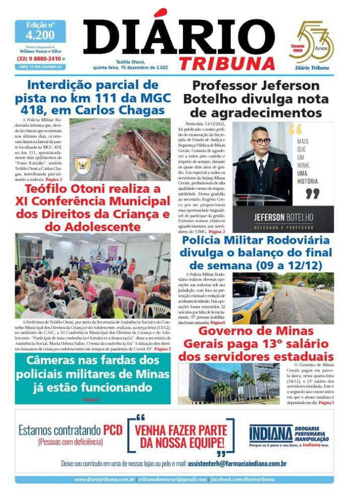 Diário Tribuna, 15 de Dezembro 2022, Teófilo Otoni – MG Por diariotribuna - 15/12/2022 0 281 Facebook Twitter Google+ Pinterest WhatsApp Acesse o link abaixo e veja a edição completa do Diário Tribuna desta quinta-feira (15/12/2022) https://diariotribuna.com.br/wp-content/uploads/2022/12/DIARIO-TRIBUNA-53-ANOS-15-DEZEMBRO-2022.pdf