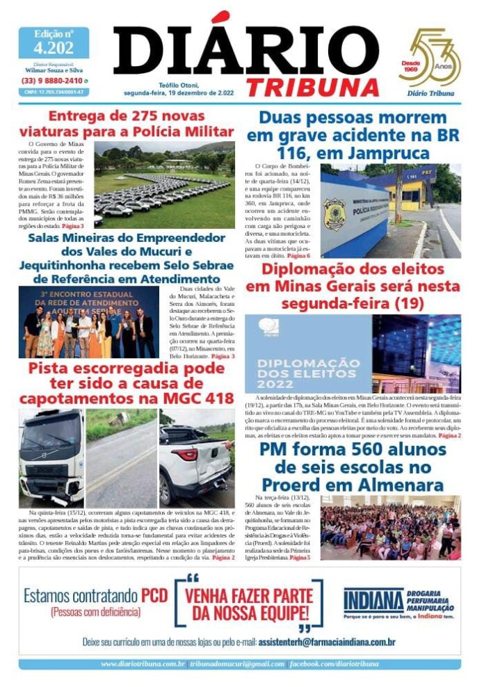 Diário Tribuna, 19 de Dezembro 2022, Teófilo Otoni – MG Por diariotribuna - 19/12/2022 0 265 Facebook Twitter Google+ Pinterest WhatsApp Acesse o link abaixo e veja a edição completa do Diário Tribuna desta segunda-feira (19/12/2022) https://diariotribuna.com.br/wp-content/uploads/2022/12/DIARIO-TRIBUNA-53-ANOS-19-DEZEMBRO-2022.pdf