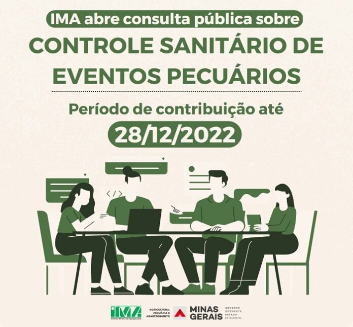 O Instituto Mineiro de Agropecuária (IMA), vinculado à Secretaria de Agricultura, Pecuária e Abastecimento (Seapa), abriu consulta pública sobre procedimentos para registro e definição de critérios de funcionamento e obrigações para entidades promotoras, eventos pecuários, médicos veterinários responsáveis técnicos e produtores para controle sanitário de eventos pecuários. Podem participar promotores, leiloeiras, produtores rurais, médicos veterinários, cooperativas, sindicatos, entidades de classe, agroindústrias e toda a sociedade civil. A iniciativa é da Comissão Permanente de Análise e Revisão de Atos Normativos (CPAR), que visa simplificar os negócios e estimular o empreendedorismo sem burocracia.