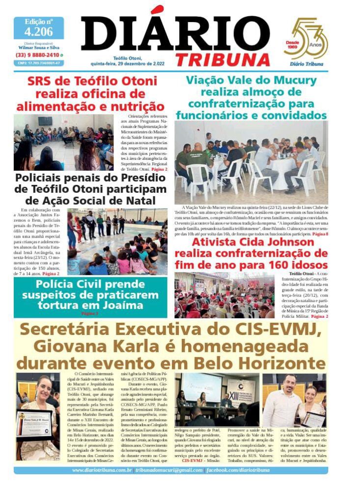 Diário Tribuna, 29 de Dezembro 2022, Teófilo Otoni – MG Por diariotribuna - 29/12/2022 0 230 Facebook Twitter Google+ Pinterest WhatsApp Acesse o link abaixo e veja a edição completa do Diário Tribuna desta quinta-feira (29/12/2022) https://diariotribuna.com.br/wp-content/uploads/2022/12/DIARIO-TRIBUNA-53-ANOS-29-DEZEMBRO-2022.pdf