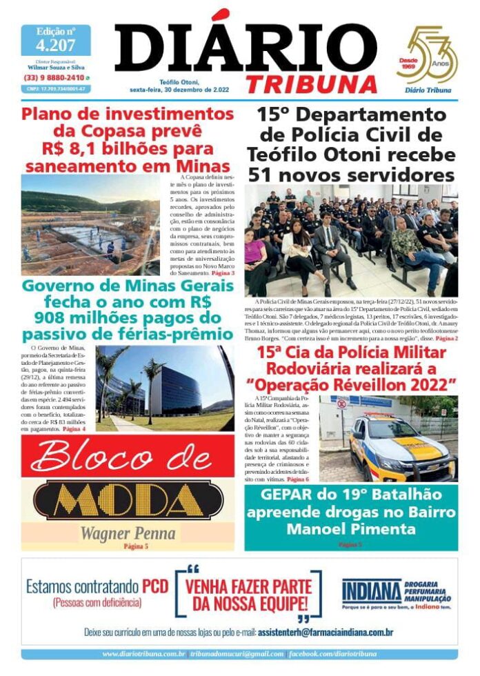 Diário Tribuna, 30 de Dezembro 2022, Teófilo Otoni – MG Por diariotribuna - 30/12/2022 0 305 Facebook Twitter Google+ Pinterest WhatsApp Acesse o link abaixo e veja a edição completa do Diário Tribuna desta sexta-feira (30/12/2022) https://diariotribuna.com.br/wp-content/uploads/2022/12/DIARIO-TRIBUNA-53-ANOS-30-DEZEMBRO-2022.pdf