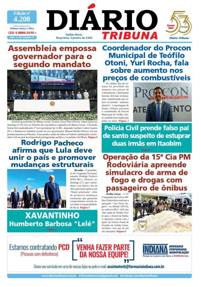 Diário Tribuna, 3 de Janeiro 2023, Teófilo Otoni – MG Por diariotribuna - 03/01/2023 0 342 Facebook Twitter Google+ Pinterest WhatsApp Acesse o link abaixo e veja a edição completa do Diário Tribuna desta terça-feira (03/01/2023) https://diariotribuna.com.br/wp-content/uploads/2023/01/DIARIO-TRIBUNA-53-ANOS-03-JANEIRO-2023.pdf