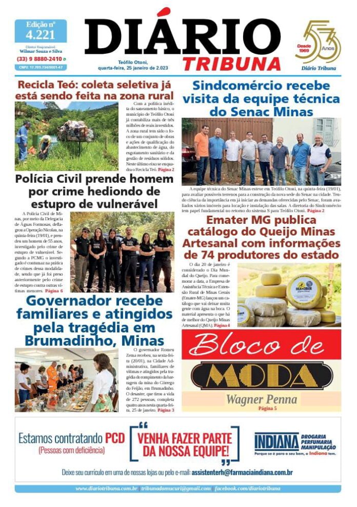 Diário Tribuna, 25 de Janeiro 2023, Teófilo Otoni – MG Por diariotribuna - 25/01/2023 0 502 Facebook Twitter Google+ Pinterest WhatsApp Acesse o link abaixo e veja a edição completa do Diário Tribuna desta quarta-feira (25/01/2023) https://diariotribuna.com.br/wp-content/uploads/2023/01/DIARIO-TRIBUNA-53-ANOS-25-JANEIRO-2023.pdf