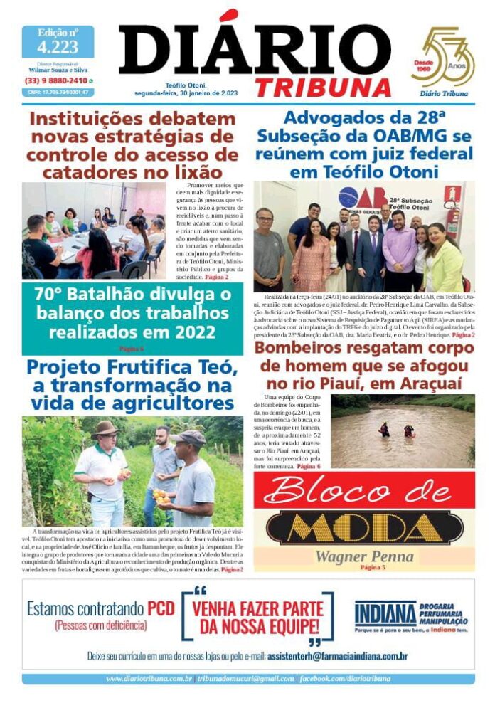 Diário Tribuna, 30 de Janeiro 2023, Teófilo Otoni – MG Por diariotribuna - 30/01/2023 0 284 Facebook Twitter Google+ Pinterest WhatsApp Acesse o link abaixo e veja a edição completa do Diário Tribuna desta segunda-feira (30/01/2023) https://diariotribuna.com.br/wp-content/uploads/2023/01/DIARIO-TRIBUNA-53-ANOS-30-JANEIRO-2023.pdf