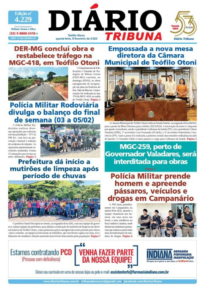 Diário Tribuna, 8 de Fevereiro 2023, Teófilo Otoni – MG Por diariotribuna - 08/02/2023 0 387 Facebook Twitter Google+ Pinterest WhatsApp Acesse o link abaixo e veja a edição completa do Diário Tribuna desta quarta-feira (08/02/2023) https://diariotribuna.com.br/wp-content/uploads/2023/02/DIARIO-TRIBUNA-53-ANOS-08-FEVEREIRO-2023.pdf