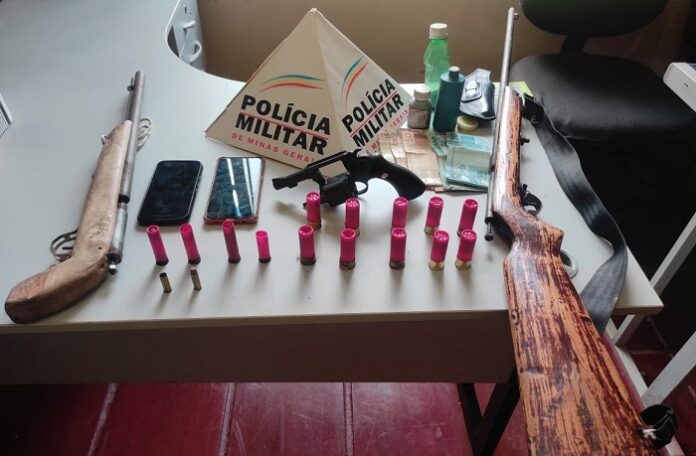 Foram apreendidos: 01 revólver calibre 38; 02 espingardas de fabricação artesanal; 09 cartuchos intactos e 01 picotado de calibre 12; 01 cartucho intacto calibre 28; 01 cartucho intacto e 01 deflagrado de calibre 38; dois telefones celulares; um coldre, R$4.500,00 em moeda corrente e material para recarga. Equipes: Tático Móvel do 19° BPM/ Militares de Caraí, Catuji e Itaipé/ Serviço de inteligência do 19º BPM. (Informações/Foto: tenente Marlos Aurélio).