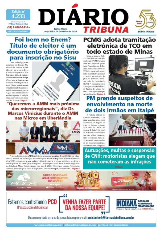 Diário Tribuna, 14 de Fevereiro 2023, Teófilo Otoni – MG Por diariotribuna - 14/02/2023 0 258 Facebook Twitter Google+ Pinterest WhatsApp Acesse o link abaixo e veja a edição completa do Diário Tribuna desta terça-feira (14/02/2023) https://diariotribuna.com.br/wp-content/uploads/2023/02/DIARIO-TRIBUNA-53-ANOS-14-FEVEREIRO-2023.pdf