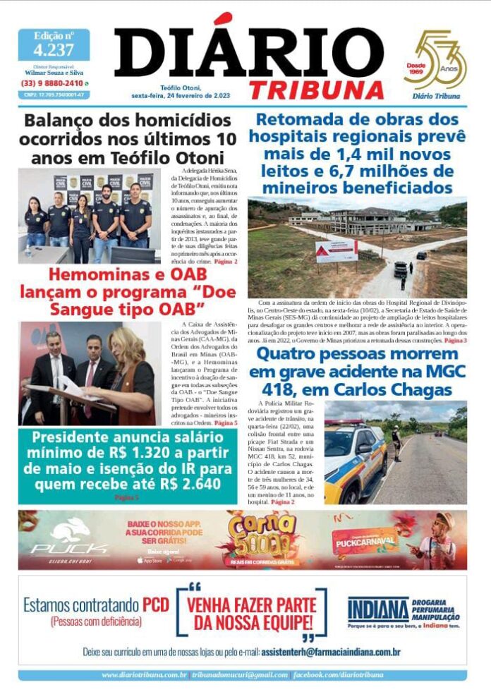 Diário Tribuna, 24 de Fevereiro 2023, Teófilo Otoni – MG Por diariotribuna - 24/02/2023 0 356 Facebook Twitter Google+ Pinterest WhatsApp Acesse o link abaixo e veja a edição completa do Diário Tribuna desta sexta-feira (24/02/2023) https://diariotribuna.com.br/wp-content/uploads/2023/02/DIARIO-TRIBUNA-53-ANOS-24-FEVEREIRO-2023.pdf