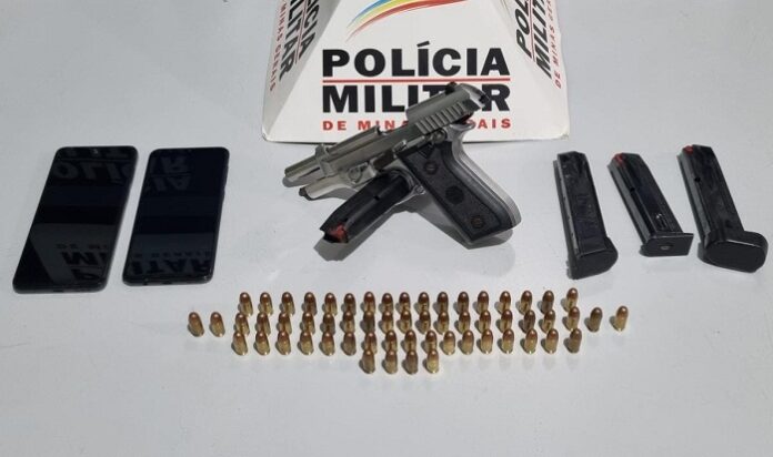 Foram apreendidos: 01 pistola calibre 380, quatro carregadores, 59 munições calibre 380 e dois telefones celulares. Equipe: cabos Vespermann, Wolff e Nogueira, soldado Lucas Simões. (Informações/Foto: assessoria de comunicação do 70º BPM/ Araçuaí).
