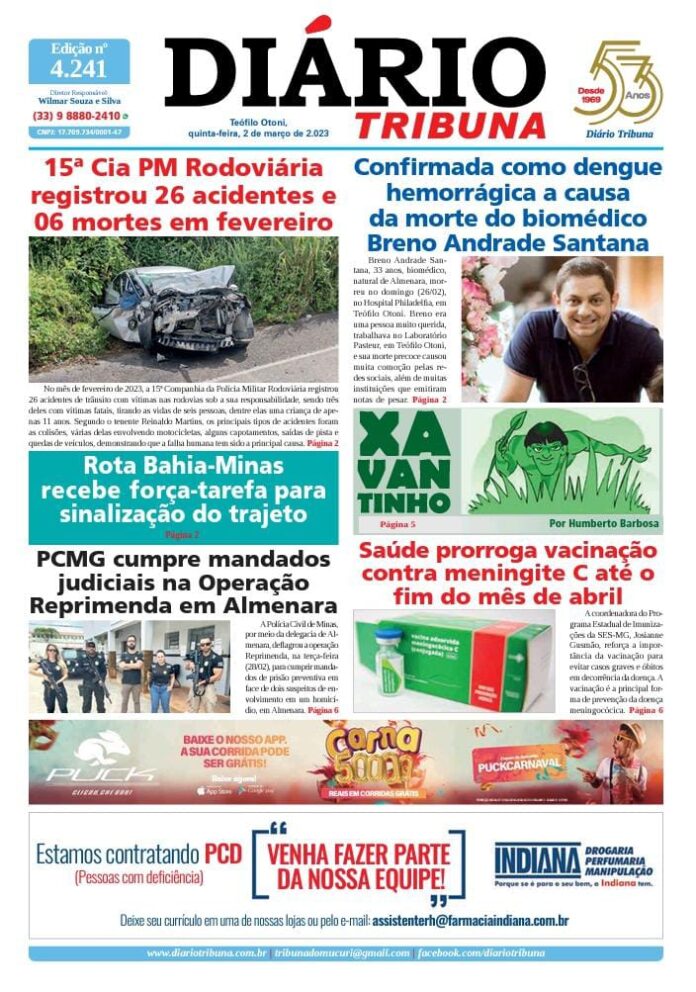 Diário Tribuna, 2 de Março 2023, Teófilo Otoni – MG Por diariotribuna - 02/03/2023 0 228 Facebook Twitter Google+ Pinterest WhatsApp Acesse o link abaixo e veja a edição completa do Diário Tribuna desta quinta-feira (02/03/2023) https://diariotribuna.com.br/wp-content/uploads/2023/03/DIARIO-TRIBUNA-53-ANOS-02-MARCO-2023.pdf