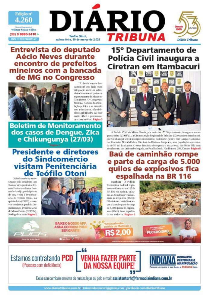 Diário Tribuna, 30 de Março 2023, Teófilo Otoni – MG Por diariotribuna - 30/03/2023 0 420 Facebook Twitter Google+ Pinterest WhatsApp Acesse o link abaixo e veja a edição completa do Diário Tribuna desta quinta-feira (30/03/2023) https://diariotribuna.com.br/wp-content/uploads/2023/03/DIARIO-TRIBUNA-53-ANOS-30-MARCO-2023.pdf