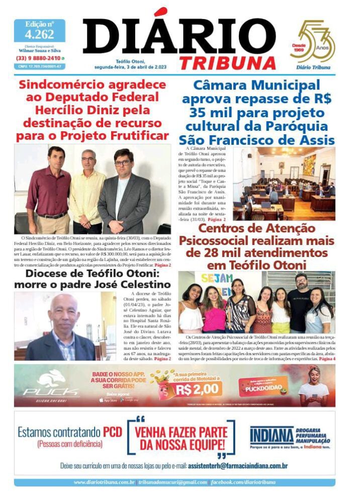 Diário Tribuna, 3 de Abril 2023, Teófilo Otoni – MG Por diariotribuna - 03/04/2023 0 441 Facebook Twitter Google+ Pinterest WhatsApp Acesse o link abaixo e veja a edição completa do Diário Tribuna desta segunda-feira (03/04/2023) https://diariotribuna.com.br/wp-content/uploads/2023/04/DIARIO-TRIBUNA-53-ANOS-03-ABRIL-2023-3.pdf