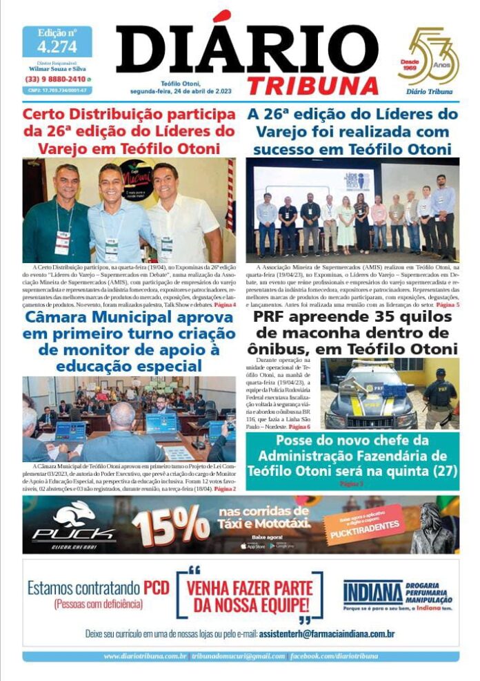 Diário Tribuna, 24 de Abril 2023, Teófilo Otoni – MG Por diariotribuna - 24/04/2023 0 348 Facebook Twitter Google+ Pinterest WhatsApp Acesse o link abaixo e veja a edição completa do Diário Tribuna desta segunda-feira (24/04/2023) https://diariotribuna.com.br/wp-content/uploads/2023/04/DIARIO-TRIBUNA-53-ANOS-24-ABRIL-2023.pdf