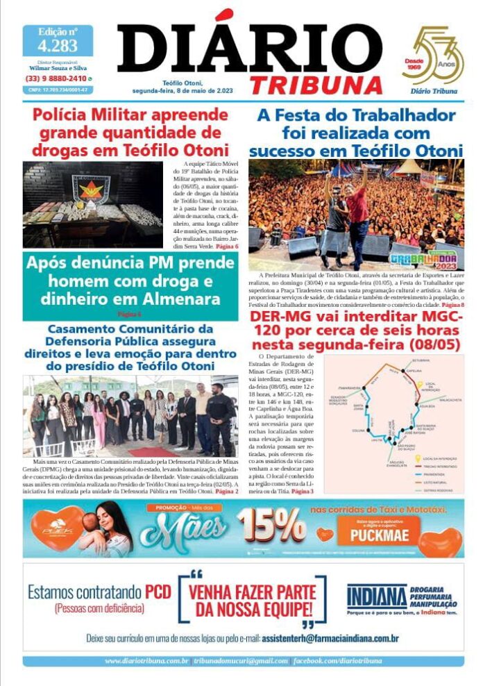 Diário Tribuna, 8 de Maio 2023, Teófilo Otoni – MG Por diariotribuna - 08/05/2023 0 305 Facebook Twitter Google+ Pinterest WhatsApp Acesse o link abaixo e veja a edição completa do Diário Tribuna desta segunda-feira (08/05/2023) https://diariotribuna.com.br/wp-content/uploads/2023/05/DIARIO-TRIBUNA-53-ANOS-08-MAIO-2023.pdf