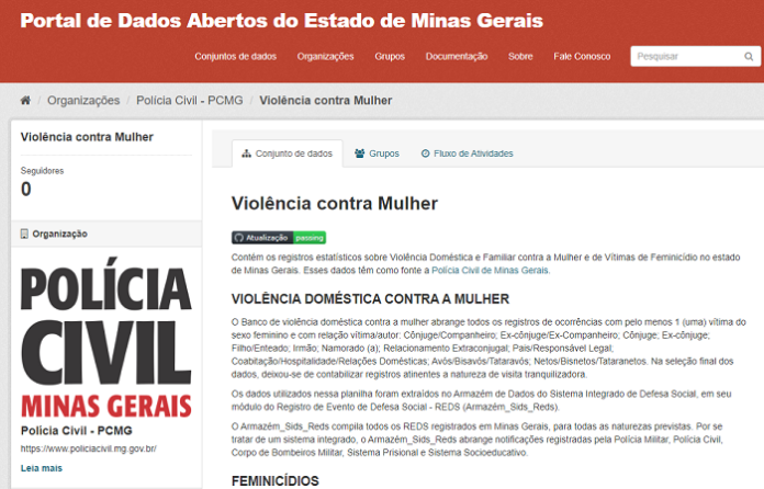 A partir deste mês, os dados de violência contra a mulher em Minas Gerais produzidos pela Polícia Civil do Estado de Minas Gerais (PCMG) estarão disponíveis também no Portal de Dados Abertos do Estado de Minas Gerais (https://dados.mg.gov.br/). Até então, as estatísticas podiam ser consultadas no portal da Secretaria de Estado de Justiça e Segurança Pública (Sejusp).