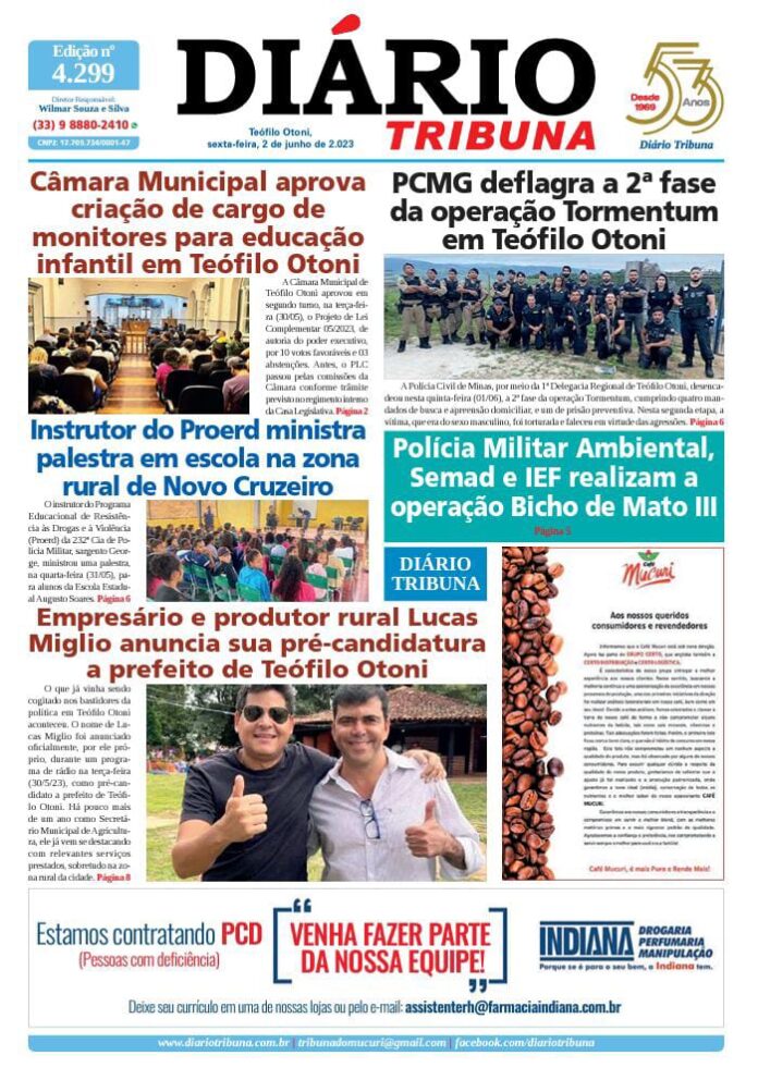 Diário Tribuna, 2 de Junho 2023, Teófilo Otoni – MG Por diariotribuna - 02/06/2023 0 471 Facebook Twitter Google+ Pinterest WhatsApp Acesse o link abaixo e veja a edição completa do Diário Tribuna desta sexta-feira (02/06/2023) https://diariotribuna.com.br/wp-content/uploads/2023/06/DIARIO-TRIBUNA-53-ANOS-02-JUNHO-2023.pdf