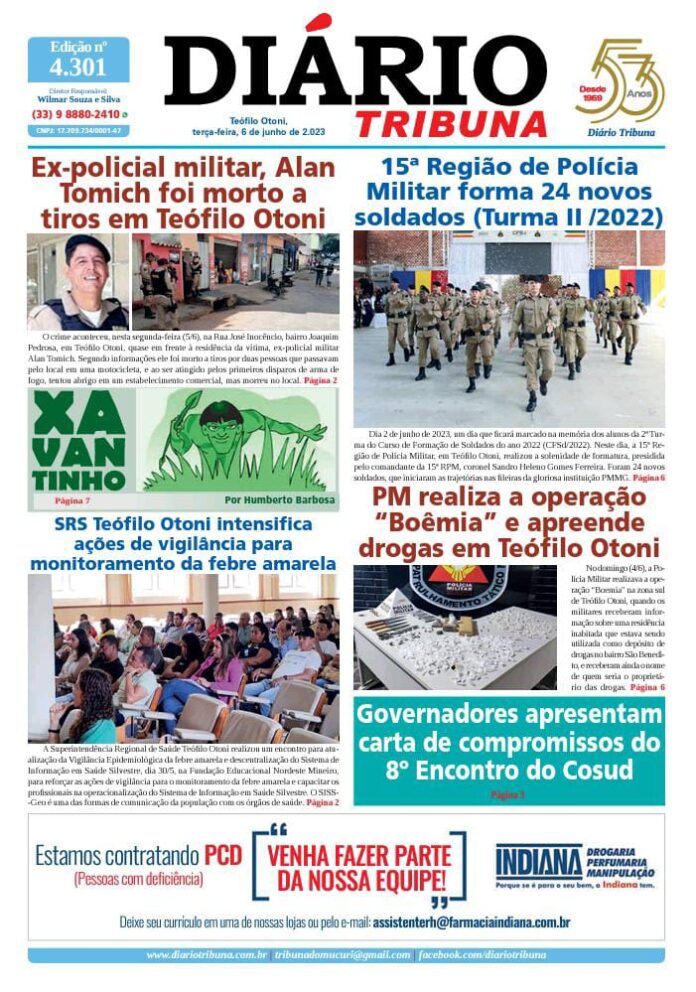Diário Tribuna, 6 de Junho 2023, Teófilo Otoni – MG Por diariotribuna - 06/06/2023 0 381 Facebook Twitter Google+ Pinterest WhatsApp Acesse o link abaixo e veja a edição completa do Diário Tribuna desta terça-feira (06/06/2023) https://diariotribuna.com.br/wp-content/uploads/2023/06/DIARIO-TRIBUNA-53-ANOS-06-JUNHO-2023.pdf
