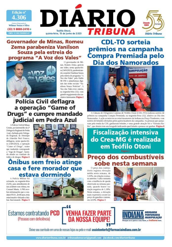 Diário Tribuna, 15 de Junho 2023, Teófilo Otoni – MG Por diariotribuna - 15/06/2023 0 278 Facebook Twitter Google+ Pinterest WhatsApp Acesse o link abaixo e veja a edição completa do Diário Tribuna desta quinta-feira (15/6/2023) https://diariotribuna.com.br/wp-content/uploads/2023/06/DIARIO-TRIBUNA-53-ANOS-15-JUNHO-2023.pdf