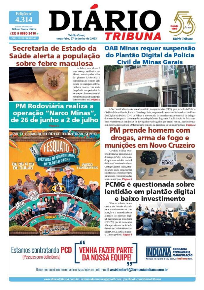 Diário Tribuna, 27 de Junho 2023, Teófilo Otoni – MG Por diariotribuna - 27/06/2023 0 332 Facebook Twitter Google+ Pinterest WhatsApp Acesse o link abaixo e veja a edição completa do Diário Tribuna desta terça-feira (27/6/2023) https://diariotribuna.com.br/wp-content/uploads/2023/06/DIARIO-TRIBUNA-53-ANOS-27-JUNHO-2023.pdf