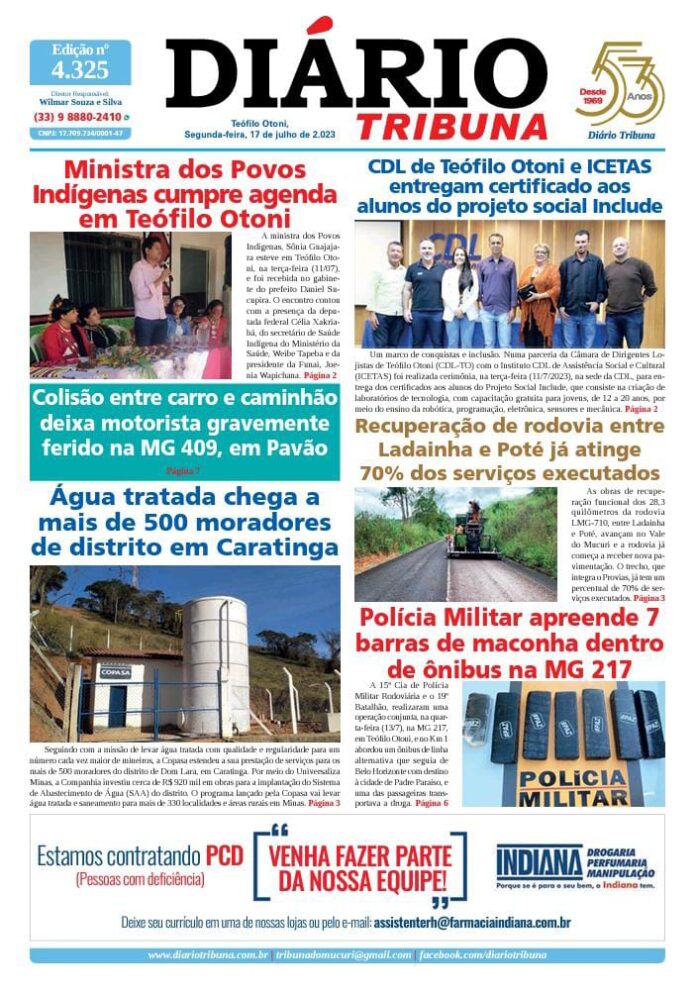 Diário Tribuna, 17 de Julho 2023, Teófilo Otoni – MG Por diariotribuna - 17/07/2023 0 391 Facebook Twitter Google+ Pinterest WhatsApp Acesse o link abaixo e veja a edição completa do Diário Tribuna desta segunda-feira (17/7/2023) https://diariotribuna.com.br/wp-content/uploads/2023/07/DIARIO-TRIBUNA-53-ANOS-17-JULHO-2023.pdf