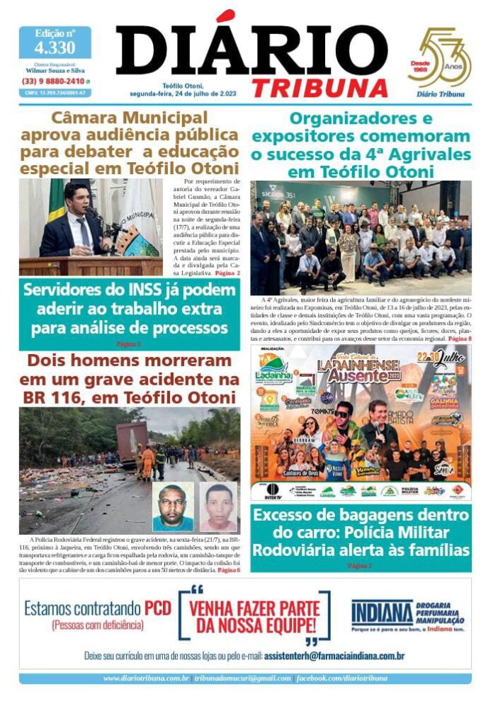 Diário Tribuna, 24 de Julho 2023, Teófilo Otoni – MG Por diariotribuna - 24/07/2023 0 324 Facebook Twitter Google+ Pinterest WhatsApp Acesse o link abaixo e veja a edição completa do Diário Tribuna desta segunda-feira (24/7/2023) https://diariotribuna.com.br/wp-content/uploads/2023/07/DIARIO-TRIBUNA-53-ANOS-24-JULHO-2023.pdf