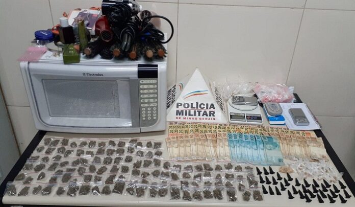 Materiais apreendidos: 114 buchas de maconha, 52 pedras mais 1 porção de crack, 33 pinos com cocaína, 4 balanças de precisão, R$ 3.000,00, vários saquinhos para embalar drogas, 1 caderno de anotações. Foram recuperados um micro-ondas e itens de salão de beleza. Equipe GEPAR: capitão Valseir, sargento Mikael, cabos Abrantes e Ribeiro. (Informações/Foto: 19º BPM/ Teófilo Otoni).