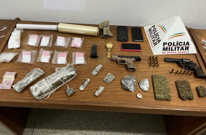 Materiais apreendidos: 1 pistola Taurus G2C, calibre 9mm, com carregador; 1 revólver Rossi; 12 munições calibre 9mm; 6 munições calibre 38; 757 pedras de crack; 144 porções pequenas e 1 barra de maconha; 139 porções pequenas e 1 grande de haxixe; 2 porções grandes e 1 pequena de cocaína; 3 celulares; 2 balanças de precisão; diversos materiais para embalagem das drogas. (Informações/Fotos: assessoria de comunicação/ 24ª Cia PM Ind/ Nanuque).