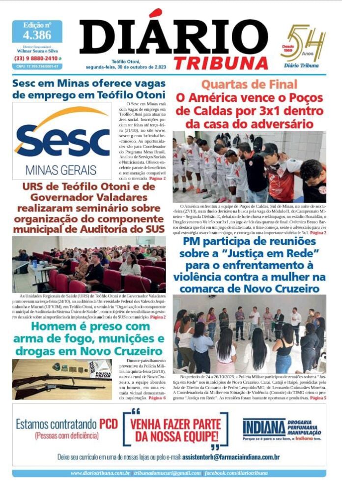 Diário Tribuna, 30 de Outubro 2023, Teófilo Otoni – MG Por diariotribuna - 30/10/2023 0 182 Facebook Twitter Google+ Pinterest WhatsApp Acesse o link abaixo e veja a edição completa do Diário Tribuna desta segunda-feira (30/10/2023) https://diariotribuna.com.br/wp-content/uploads/2023/10/DIARIO-TRIBUNA-54-ANOS-30-OUTUBRO-2023.pdf