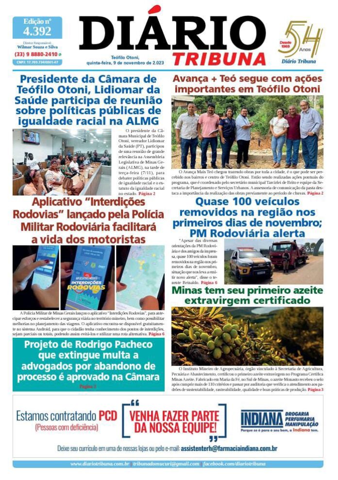 Diário Tribuna, 9 de Novembro 2023, Teófilo Otoni – MG Por diariotribuna - 09/11/2023 0 59 Facebook Twitter Google+ Pinterest WhatsApp Acesse o link abaixo e veja a edição completa do Diário Tribuna desta quinta-feira (9/11/2023) https://diariotribuna.com.br/wp-content/uploads/2023/11/DIARIO-TRIBUNA-54-ANOS-09-NOVEMBRO-2023.pdf