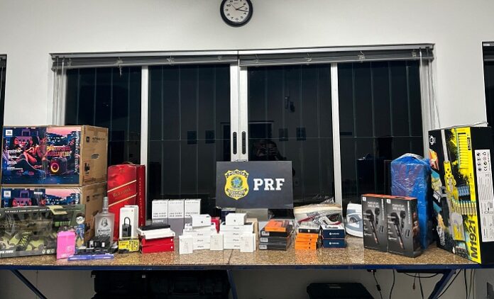 Ao vistoriar o veículo, a equipe encontrou diversos tipos de mercadoria, dentre elas: 193 cigarros eletrônicos, 103 perfumes, 7 Iphones 15 pro Max, 15 smartwatchs, 5 air phones, 10 pares de tênis, 5 garrafas de whisky, R$ 6 mil em espécie, 1 pistola com dois carregadores municiados com 26 munições, aparelhagem de som e materiais diversos.