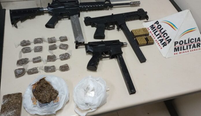 Foram apreendidos: 2 carabinas adaptada artesanalmente, uma para o calibre 9mm e outra para o calibre 38, 1 submetralhadora de fabricação artesanal calibre 380, 1 carregador alongado adaptado para munição 9mm, 2 carregadores alongados adaptados para munição 380, 76 munições intactas calibre 9mm, 16 munições intactas calibre 380, 16 tabletes menores, 1 tablete maior, e 1 porção fracionada de maconha, 1 porção pequena de cocaína, e 1 balança de precisão. Equipe GEPAR: sargento Mikael, cabos Abrantes e Luiz Carlos. Viatura do CPU: tenente Marcílio, cabo Jhonatas. (Informações/Foto: PMMG/ 19º BPM).