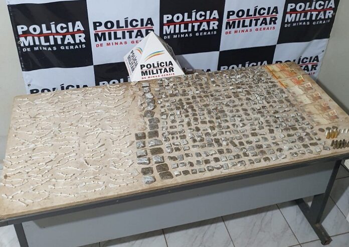 Foram apreendidos: 379 buchas mais 20 tabletes grandes de maconha, 9 pinos com cocaína, 13 pedras grandes de crack e 334 pedras prontas para a revenda, 9 munições calibre 32, R$ 263,00 em dinheiro. Equipe: cabo Bruno, soldado Feitosa. Fale com a Polícia Militar: emergência ligue 190, disque denúncia unificado ligue 181. Sigilo absoluto, identidade preservada. Operação foi realizada na terça-feira (21/11). (Informações/Foto: PMMG/ Jampruca).