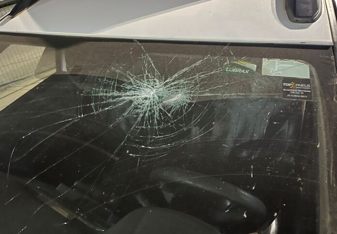Em outra ocasião, já na rua principal do distrito, quando o guincho se aproximou para remover os três veículos, os militares foram surpreendidos com várias pedras sendo arremessadas da rua de cima, em direção à equipe e veículos apreendidos, tendo uma delas atingido o para-brisa da viatura, danificando-o. Diante do crime de dano qualificado ao patrimônio público, a equipe foi ao local, onde deparou com o autor, que portava pedras nas mãos, sendo determinado que largasse as pedras e colocasse as mãos na cabeça.
