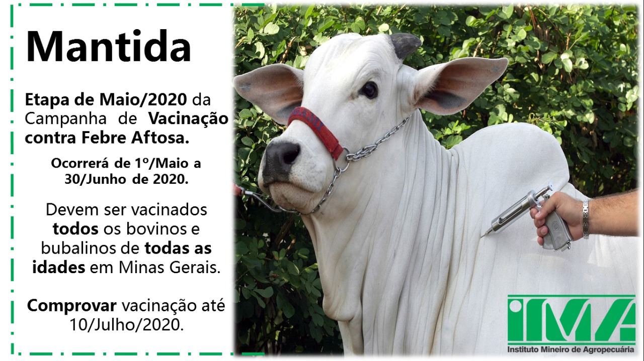 Devido a pandemia do coronavírus (COVID-19) a etapa de vacinação contra Febre Aftosa ficará compreendida entre o período de 01/05/2020 a 30/06/2020. Bovinos e bubalinos de todas as idades deverão ser vacinados.