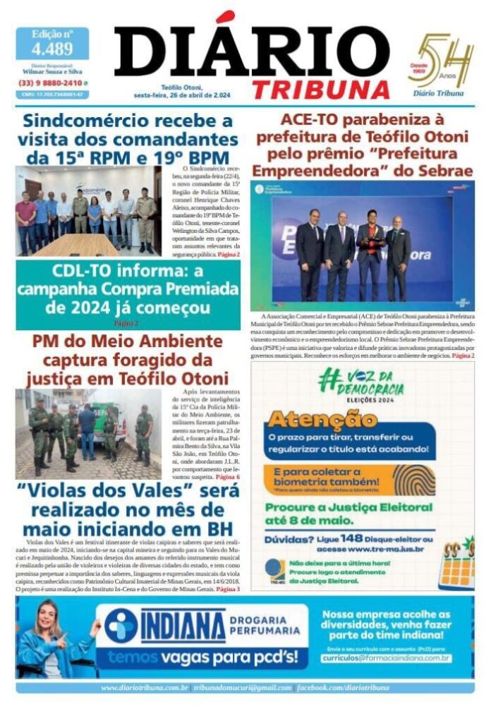 Diário Tribuna, 26 de Abril de 2024, Teófilo Otoni – MG Por diariotribuna - 26/04/2024 0 128 Facebook Twitter Google+ Pinterest WhatsApp Acesse o link abaixo e veja a edição completa do Diário Tribuna desta sexta-feira (26/4) https://diariotribuna.com.br/wp-content/uploads/2024/04/DIARIO-TRIBUNA-54-ANOS-26-ABRIL-2024.pdf