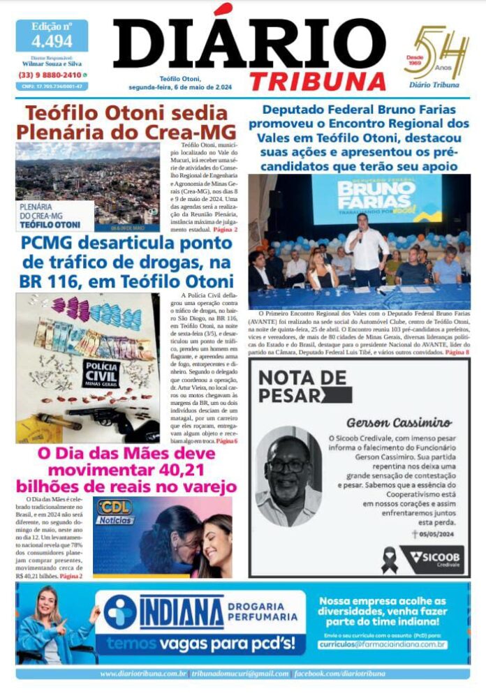 Diário Tribuna, 6 de Maio de 2024, Teófilo Otoni – MG Por diariotribuna - 06/05/2024 0 113 Facebook Twitter Google+ Pinterest WhatsApp Acesse o link abaixo e veja a edição completa do Diário Tribuna desta segunda-feira (6/5) https://diariotribuna.com.br/wp-content/uploads/2024/05/DIARIO-TRIBUNA-54-ANOS-06-MAIO-2024.pdf