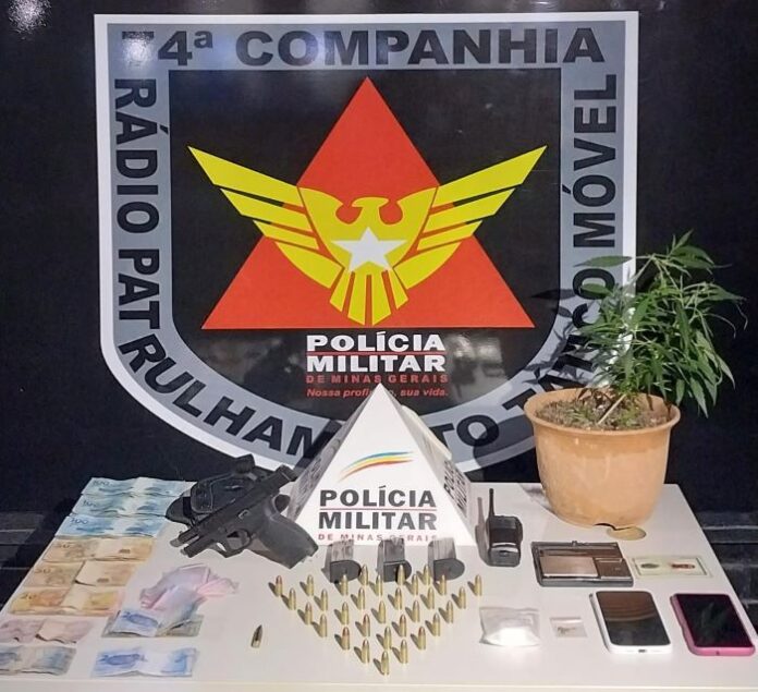 Materiais apreendidos: 1 pistola Beretta semiautomática calibre 9mm, 31 cartuchos intactos calibre 9mm, 1 cartucho fuzil 556, 3 carregador PT 9mm, 1 rádio comunicador, 1 balança de precisão, 1 porção de cocaína, 1 coldre para arma de fogo, 1 documento de identificação falsificado, R$ 3.335.00 em dinheiro. (Informações/Foto: PMMG/ 19º BPM).