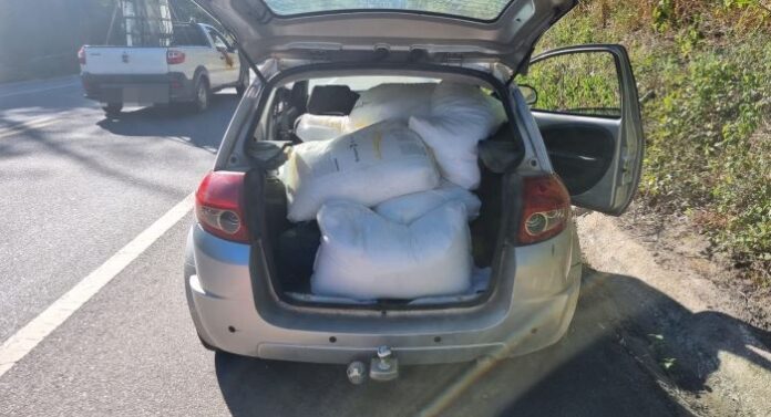 Percebendo a presença policial, os dois indivíduos entraram no veículo e fugiram, mas os policiais conseguiram fazer a abordagem e constataram que havia 250kg da carga (10 sacos de 25kg) furtada dentro do veículo que eles estavam.