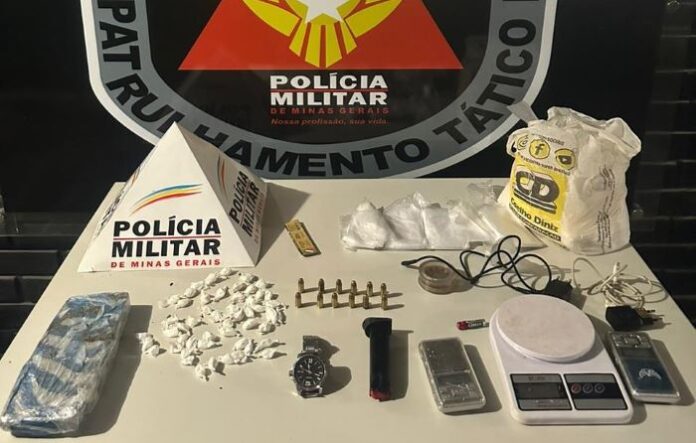 Foram apreendidos: 52 papelotes com cocaína, 1 barra de maconha, 1 carregador e 12 munições de calibre 380, 3 balanças de precisão, vasta quantidade de materiais para embalar drogas e 1 relógio. Os materiais foram encaminhados para da delegacia de Polícia Civil local, para os procedimentos de polícia judiciária. (Informações/Foto: PMMG/ 19º BPM).