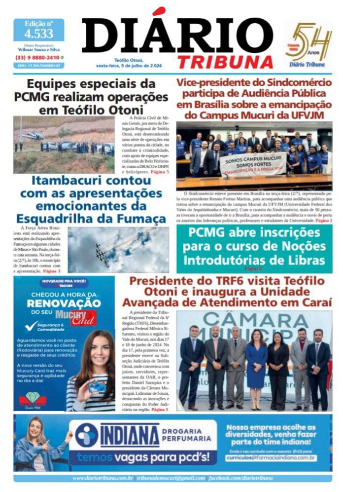 Diário Tribuna, 5 de Julho de 2024, Teófilo Otoni – MG Por diariotribuna - 05/07/2024 0 116 Facebook Twitter Google+ Pinterest WhatsApp Acesse o link abaixo e veja a edição completa do Diário Tribuna desta sexta-feira (5/7) https://diariotribuna.com.br/wp-content/uploads/2024/07/DIARIO-TRIBUNA-54-ANOS-05-JULHO-2024.pdf