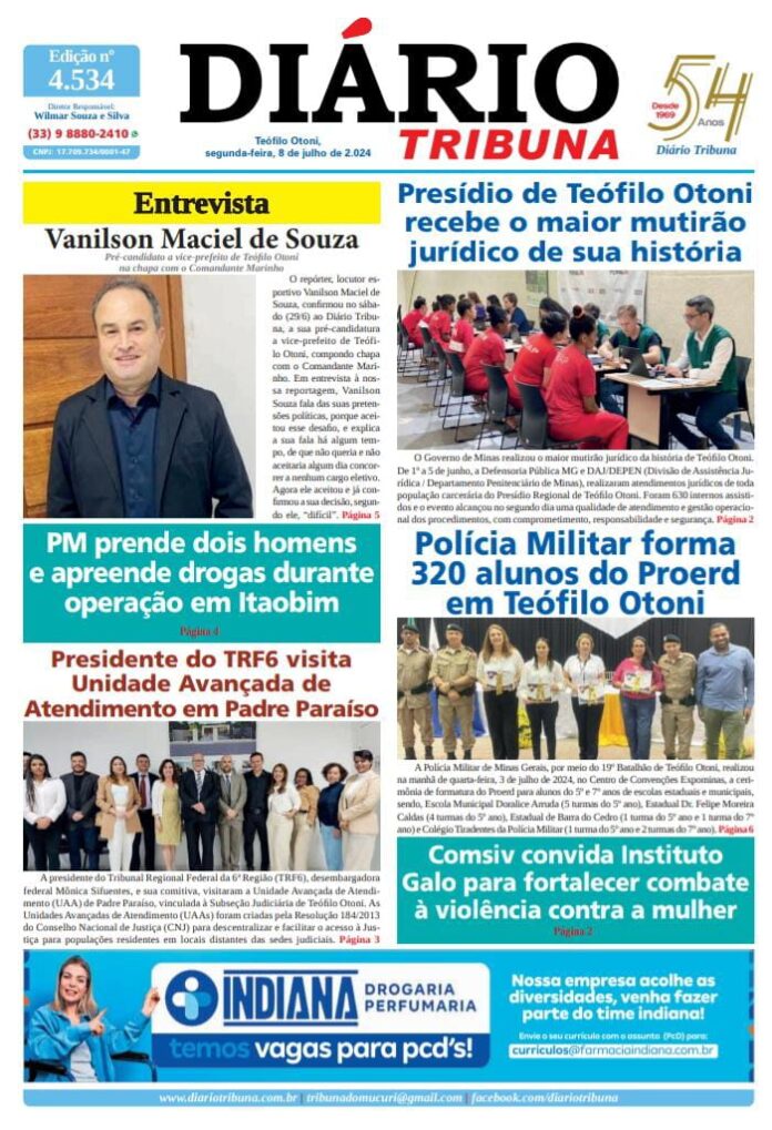 Diário Tribuna, 8 de Julho de 2024, Teófilo Otoni – MG Por diariotribuna - 08/07/2024 0 221 Facebook Twitter Google+ Pinterest WhatsApp Acesse o link abaixo e veja a edição completa do Diário Tribuna desta segunda-feira (8/7) https://diariotribuna.com.br/wp-content/uploads/2024/07/DIARIO-TRIBUNA-54-ANOS-08-JULHO-2024.pdf
