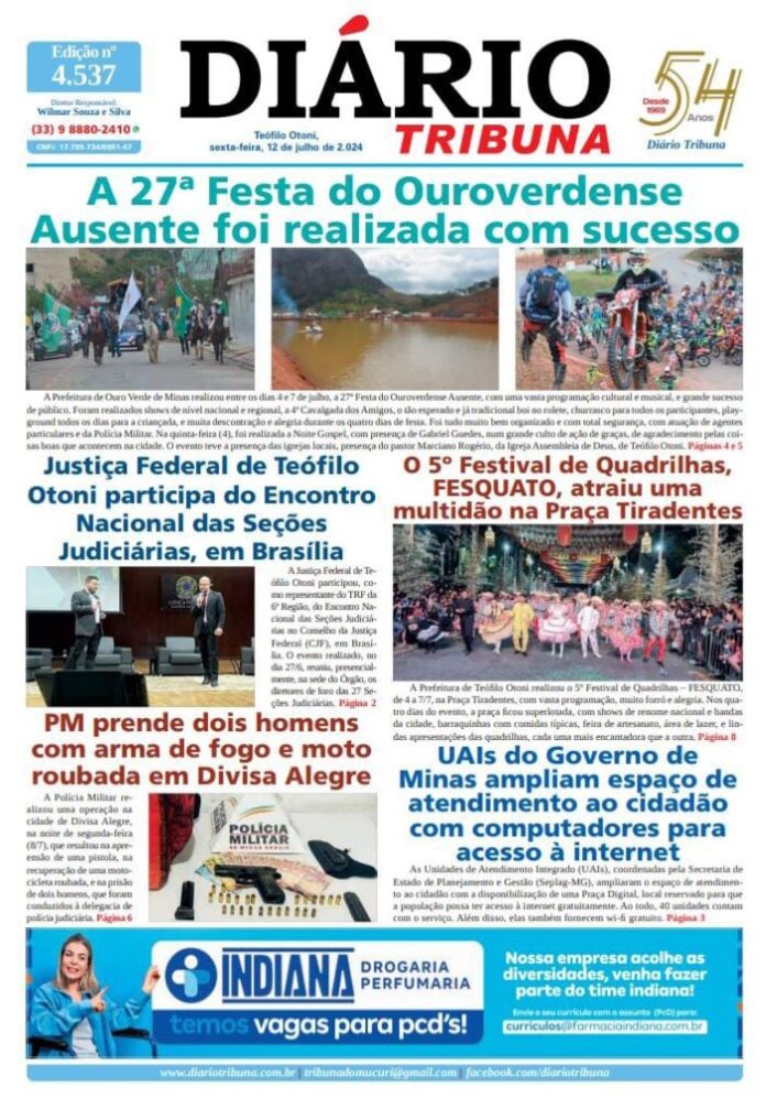 Diário Tribuna, 12 de Julho de 2024, Teófilo Otoni – MG Por diariotribuna - 12/07/2024 0 162 Facebook Twitter Google+ Pinterest WhatsApp Acesse o link abaixo e veja a edição completa do Diário Tribuna desta sexta-feira (12/7) https://diariotribuna.com.br/wp-content/uploads/2024/07/DIARIO-TRIBUNA-54-ANOS-12-JULHO-2024.pdf