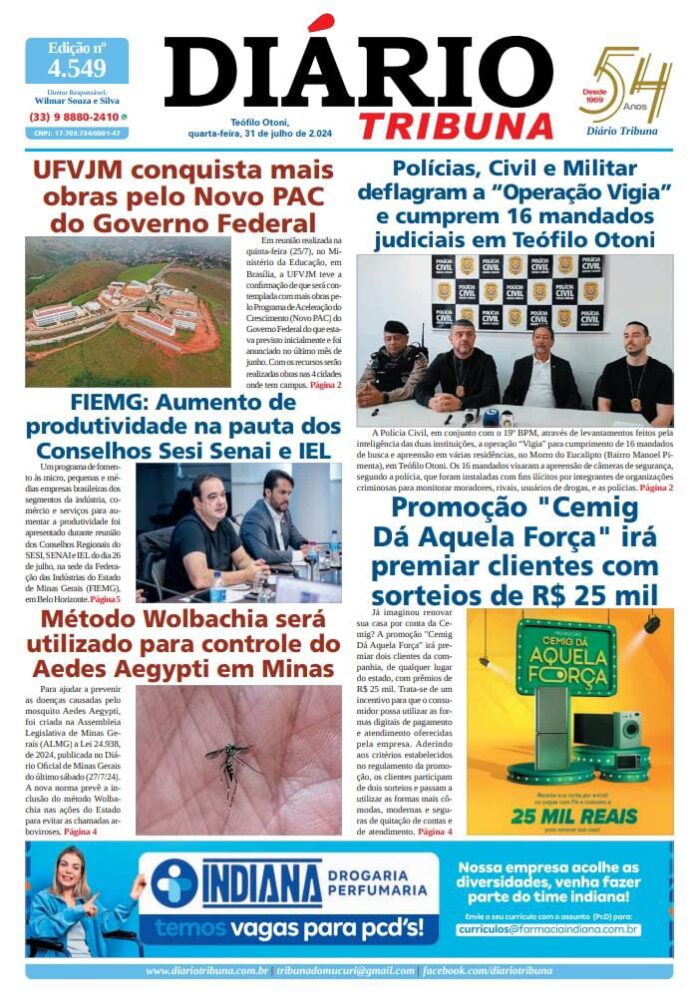 Diário Tribuna, 31 de Julho de 2024, Teófilo Otoni – MG Por diariotribuna - 31/07/2024 0 225 Facebook Twitter Google+ Pinterest WhatsApp Acesse o link abaixo e veja a edição completa do Diário Tribuna desta quarta-feira (31/7) https://diariotribuna.com.br/wp-content/uploads/2024/07/DIARIO-TRIBUNA-54-ANOS-31-JULHO-2024.pdf