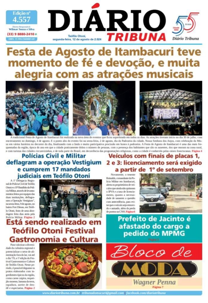 Diário Tribuna, 12 de Agosto de 2024, Teófilo Otoni – MG Por diariotribuna - 12/08/2024 0 122 Facebook Twitter Google+ Pinterest WhatsApp Acesse o link abaixo e veja a edição completa do Diário Tribuna desta segunda-feira (12/8) https://diariotribuna.com.br/wp-content/uploads/2024/08/DIARIO-TRIBUNA-54-ANOS-12-AGOSTO-2024.pdf