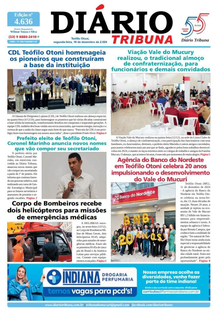 Diário Tribuna, 16 de Dezembro de 2024, Teófilo Otoni – MG 16/12/2024 0 137 Facebook Twitter Google+ Pinterest WhatsApp Acesse o link abaixo e veja a edição completa do Diário Tribuna desta segunda-feira (16/12/2024) https://diariotribuna.com.br/wp-content/uploads/2024/12/DIARIO-TRIBUNA-55-ANOS-16-DEZEMBRO-2024.pdf