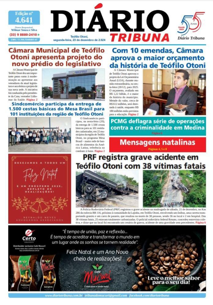 Diário Tribuna, 23 de Dezembro de 2024, Teófilo Otoni – MG Por diariotribuna - 23/12/2024 0 116 Facebook Twitter Google+ Pinterest WhatsApp Acesse o link abaixo e veja a edição completa do Diário Tribuna desta segunda-feira (23/12/2024) https://diariotribuna.com.br/wp-content/uploads/2024/12/DIARIO-TRIBUNA-55-ANOS-23-DEZEMBRO-2024.pdf