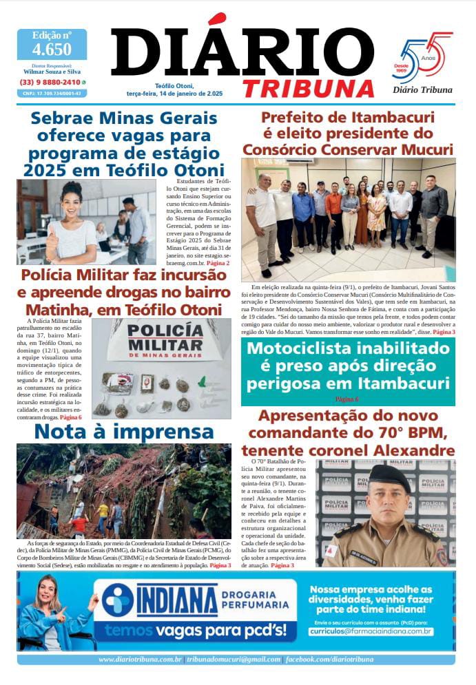 Diário Tribuna, 14 de Janeiro de 2025, Teófilo Otoni – MG Por diariotribuna - 14/01/2025 0 112 Facebook Twitter Google+ Pinterest WhatsApp Acesse o link abaixo e veja a edição completa do Diário Tribuna desta terça-feira (14/1/2025) https://diariotribuna.com.br/wp-content/uploads/2025/01/DIARIO-TRIBUNA-55-ANOS-14-JANEIRO-2025.pdf