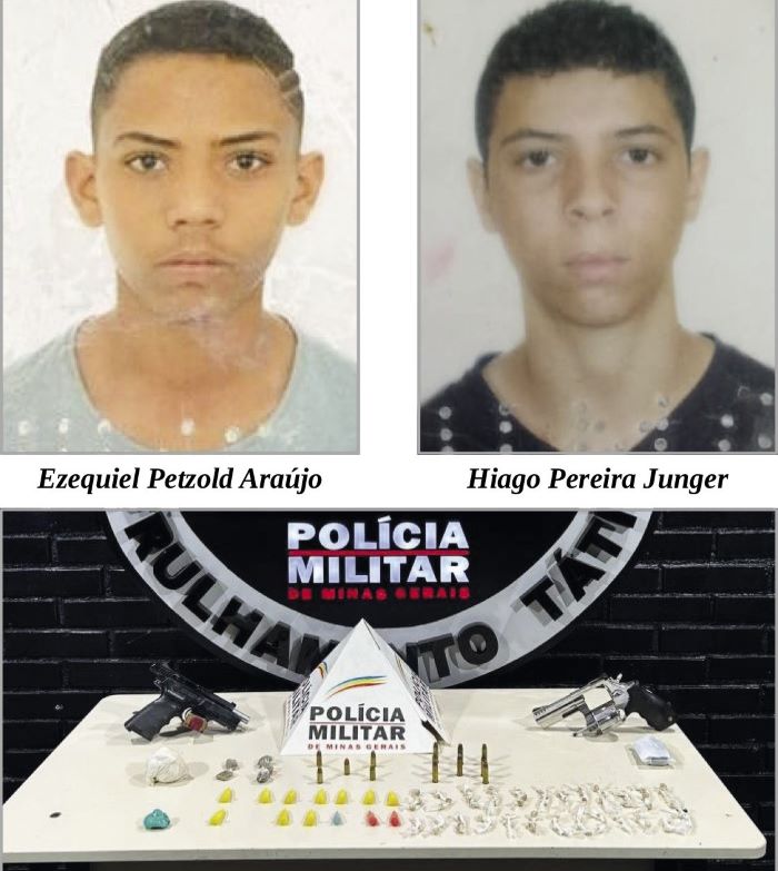 Foram apreendidos: 1 pistola Israelense calibre 9mm; 1 revólver e 8 cartuchos de calibre 38; 5 cartuchos calibre 9mm; pedras de crack; pinos com cocaína; maconha; pasta base de cocaína; 2 telefones celulares e um veículo. (Informações/ Foto: assessoria de comunicação do 19º BPM/ Teófilo Otoni). As vítimas fatais são: Hiago Pereira Junger, 27 anos, e Ezequiel Petzold Araújo, 22.