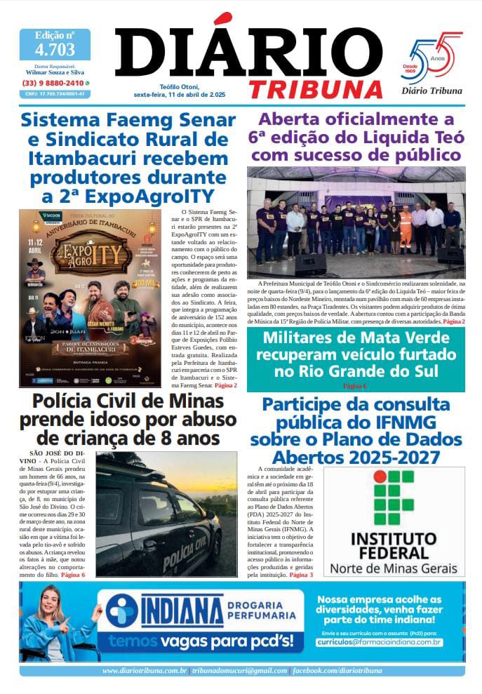 Diário Tribuna, 11 de Abril de 2025, Teófilo Otoni – MG 11/04/2025 0 89 Facebook Twitter Google+ Pinterest WhatsApp Acesse o link abaixo e veja a edição completa do Diário Tribuna desta sexta-feira (11/4/2025) https://diariotribuna.com.br/wp-content/uploads/2025/04/DIARIO-TRIBUNA-55-ANOS-11-ABRIL-2025.pdf